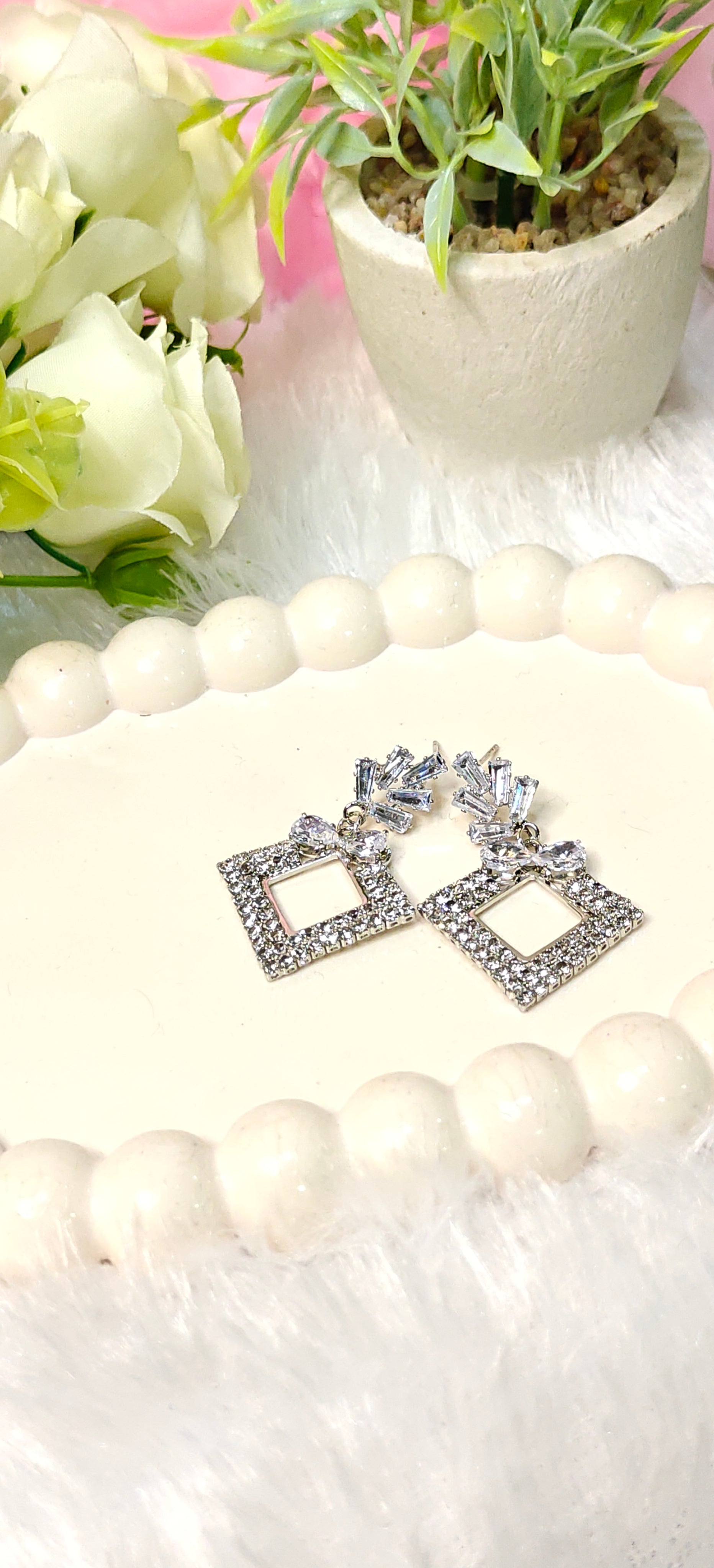 Add a touch of glam to your look with these dazzling square frame earrings! Featuring sparkling rhinestones intricately set in a geometric diamond shape, topped with a chic cluster of crystals, these earrings offer a perfect blend of modern style and timeless sparkle.
