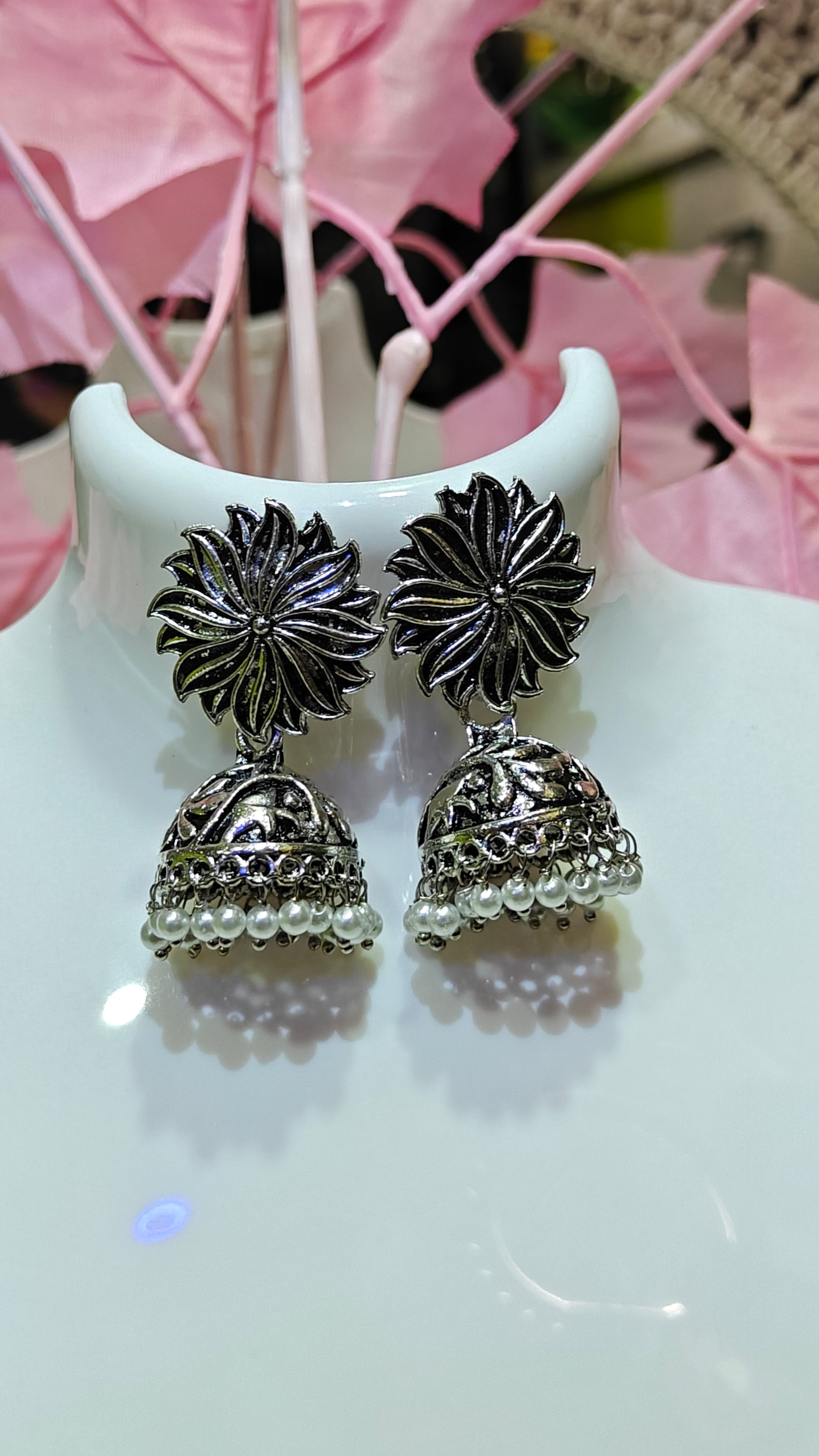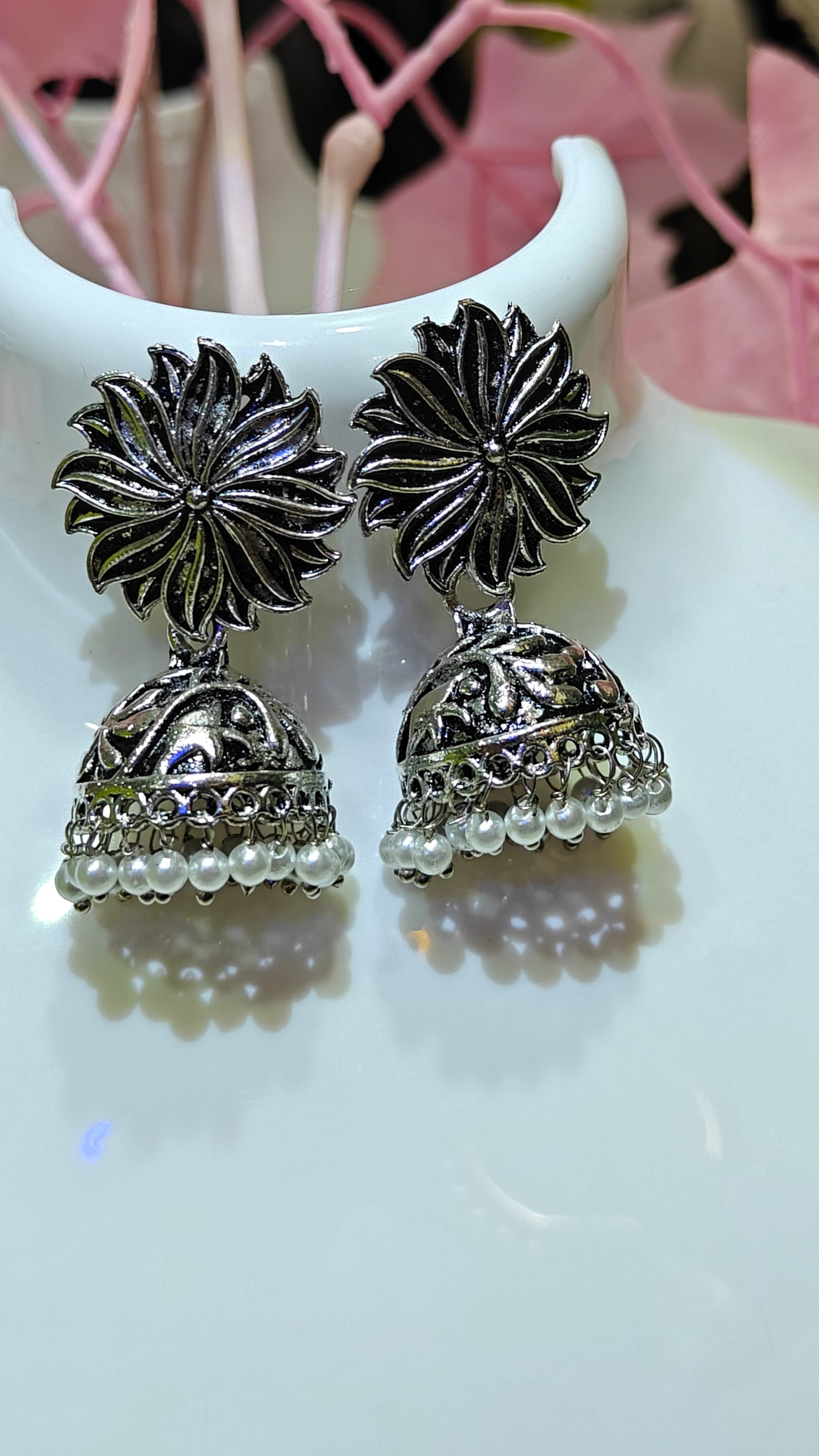 Each pair of these exquisite oxidized silver earrings tells a story of strength and style—whether it’s the intricately patterned hoops, the classic jhumkas with pearl fringes, the bold black bead-studded danglers, or the elegant floral motifs.