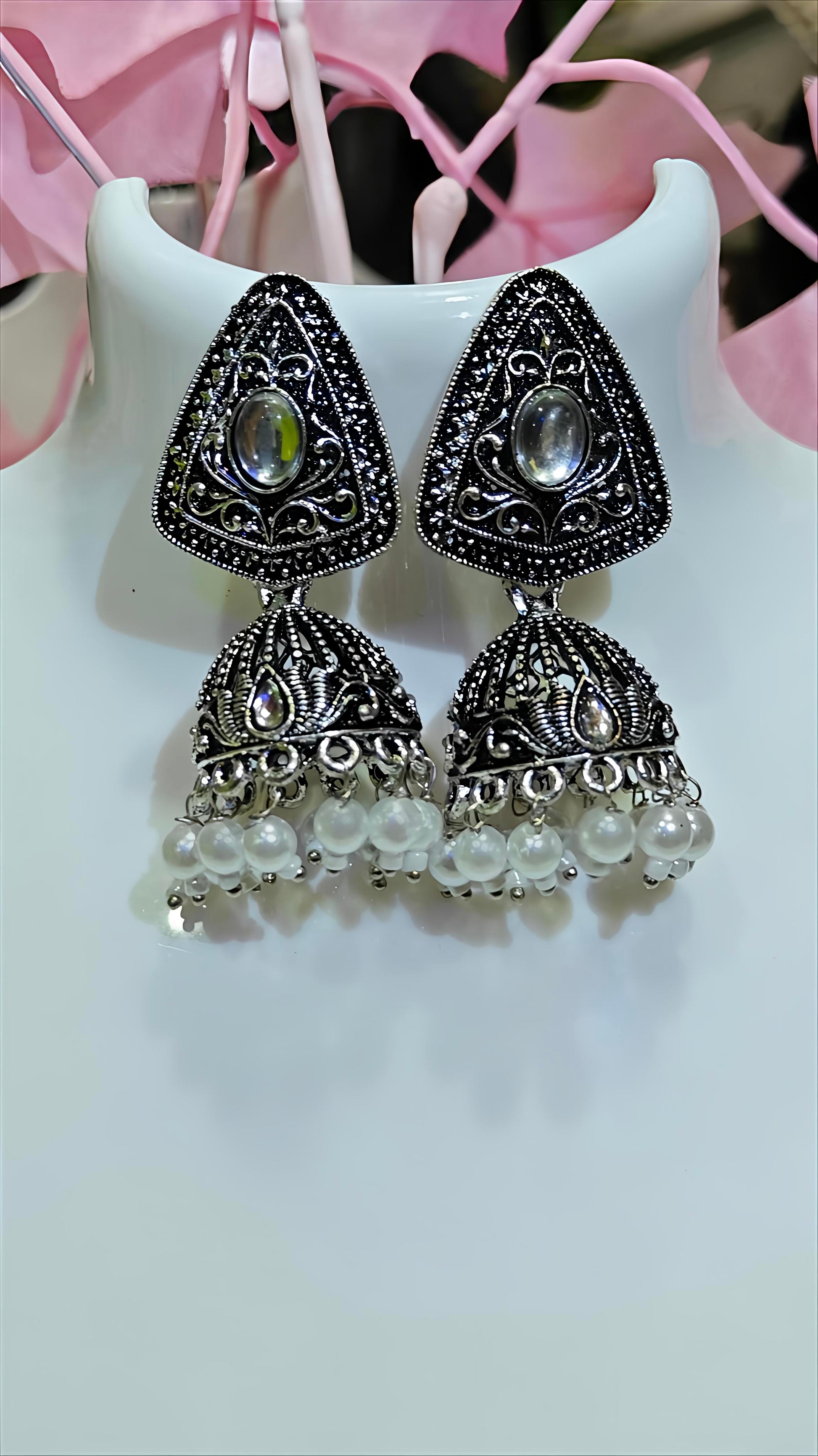 These stunning oxidized silver jhumkas are crafted to keep their shine and charm through life’s ups and downs. Featuring intricate detailing and delicate pearl drops, they blend tradition with resilience—just like you. Wear them confidently every day, knowing they’ll stay radiant and untarnished, no matter where life takes you. ✨